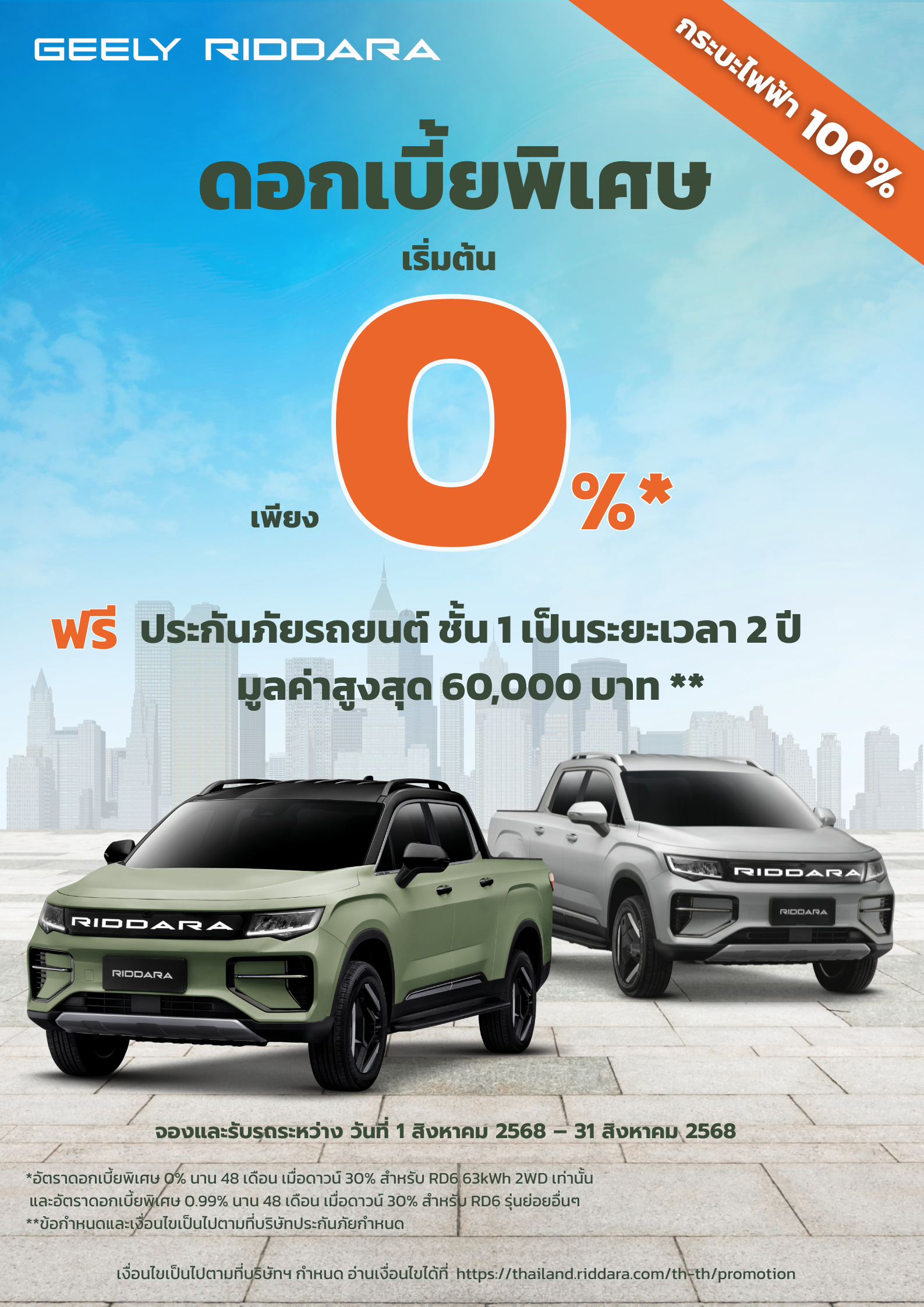 - วางเงินมัดจำ เพื่อรับข้อเสนอพิเศษ RIDDARA โดยจองและรับรถระหว่างวันที่ 1 สิงหาคม 2568 – 31 สิงหาคม 2568
