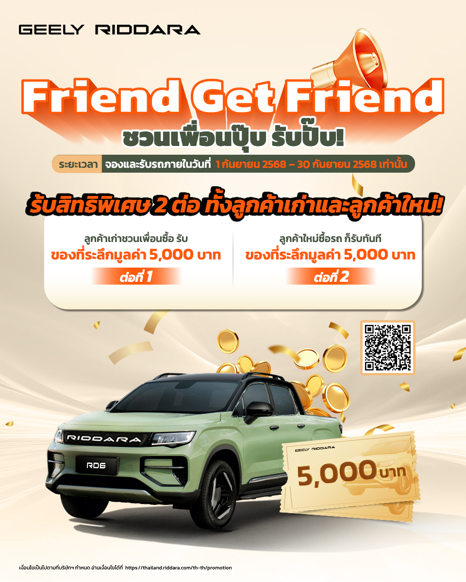 - ลูกค้าเดิมจะได้รับของที่ระลึกมูลค่า 5,000 บาทต่อการซื้อรถกระบะไฟฟ้าRIDDARA RD6 คันใหม่ 1 คันของลูกค้าใหม่และลูกค้าใหม่จะได้รับของที่ระลึกมูลค่า 5,000 บาทภายใต้เงื่อนไขดังต่อไปนี้