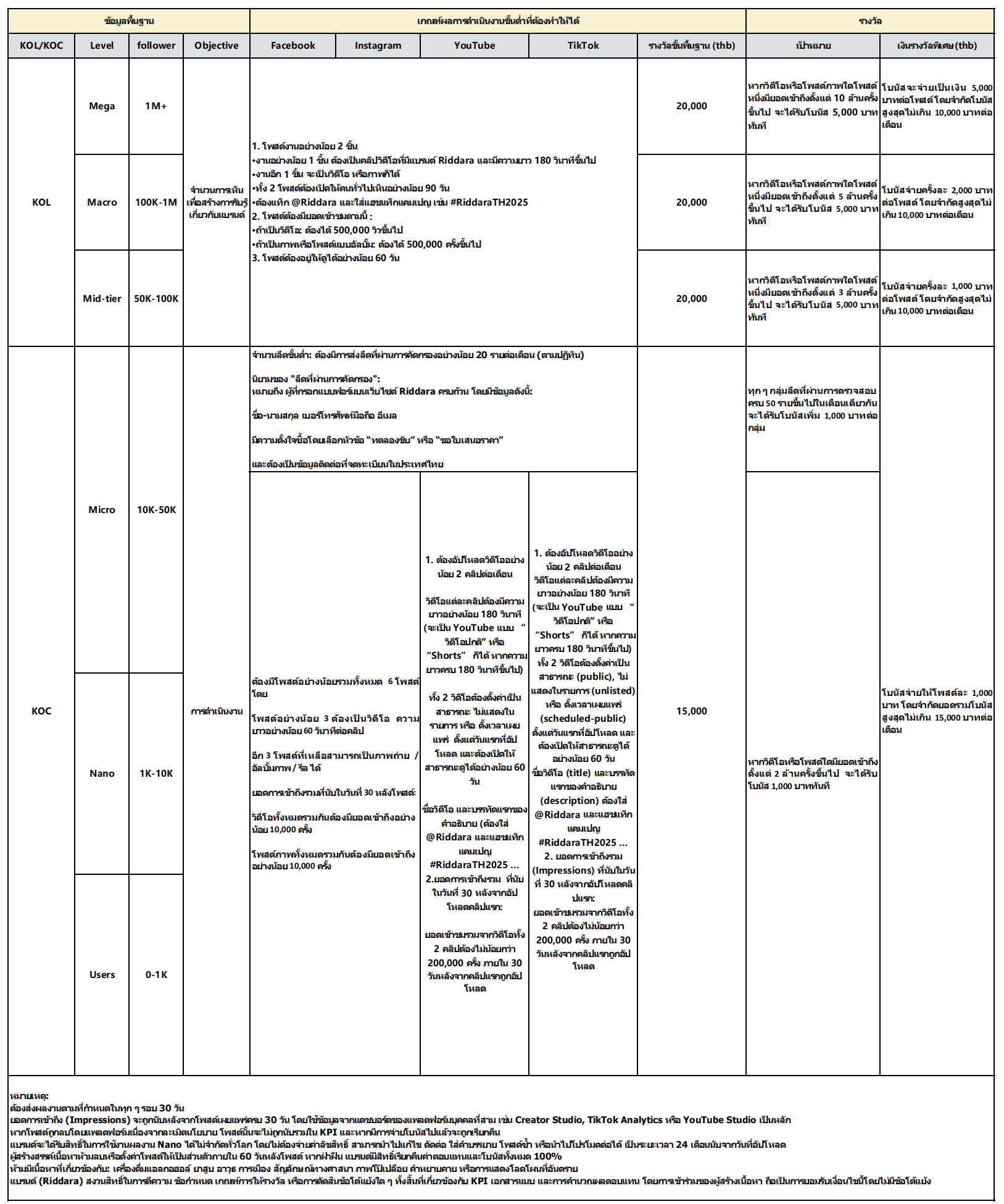 4.2 KOC: เจ้าของรถ RIDDARA ที่มีจำนวนผู้ติดตามบนแพลตฟอร์มสาธารณะ (เช่น Facebook, TikTok, Instagram, YouTube เป็นต้น) อยู่ระหว่าง 1–1,000 คนต่อแพลตฟอร์ม และมีการเผยแพร่ภาพลักษณ์เชิงบวกของแบรนด์และข้อมูลผลิตภัณฑ์บนแพลตฟอร์มโซเชียลดังกล่าว